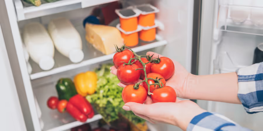 Für das volle Aroma sollten Tomaten bei Raumtemperatur aufbewahrt werden, bis sie vollständig gereift sind. Danach können sie zur längeren Haltbarkeit in den Kühlraum wandern – jedoch nur für kurze Zeit.