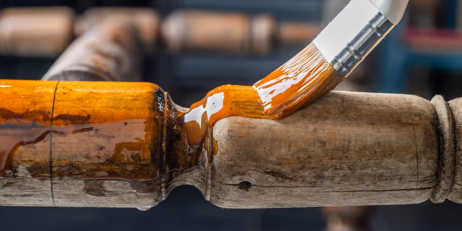 Wenn das Holz sauber ist, tragen sie eine Grundierung auf – am besten eine Öl oder Shellac. Diese Grundierungen schützen das Holz besser als wasserbasierte Alternativen und sorgen für ein gleichmässiges Farbergebnis.