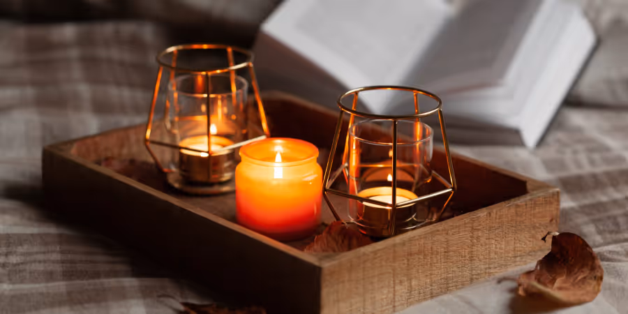 Eine kleine Aromalampe mit Kerze und Duftöl ergänzt ein behagliches Schlafzimmer hervorragend. Wählen Sie Ihren Lieblingsduft und platzieren Sie ihn vor allem dort, wo Ihr Blick oft hinfällt. So können Sie das Aroma und den warmen Schein der Flamme geniessen.