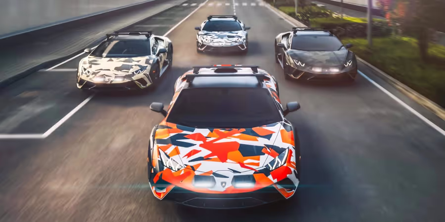 Auf der Mailänder Designwoche vorgestellt, zeigt sich der Huracán Sterrato All-Terrain in vier verschiedenen Tarnfarben – inspiriert von Schnee, Sand, Wald und Erde. Jedes Auto sticht hervor durch seinen mattschwarzen Look auf Dach und Motorhaube sowie Dachreling und Querträger.