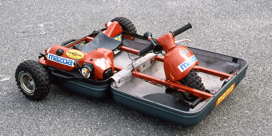Mazda-Ingenieure bewiesen 1991 echten Erfindergeist bei einem internen Wettbewerb. Sie integrierten ein komplettes Fahrzeug in einen stabilen Hartschalenkoffer.