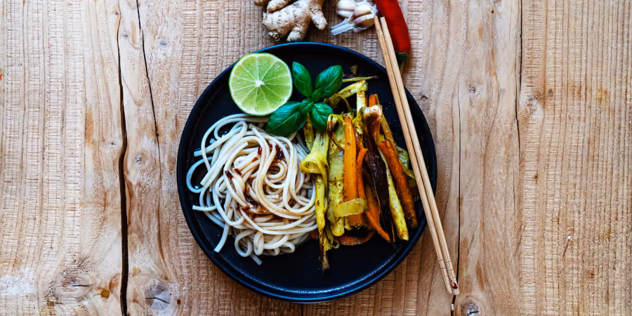 Was passt zu Ofengemüse? Food-Blogger Manfred Zimmer findet eine Zutat besonders spannend: Udon-Nudeln. So verpasst er Sellerie und Co. einen japanischen Dreh.