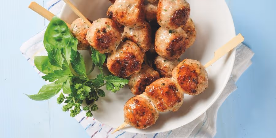 3. Aus dem Fleischteig mit nassen Händen 24 kleine Kugeln formen und diese auf Spiesse stecken.