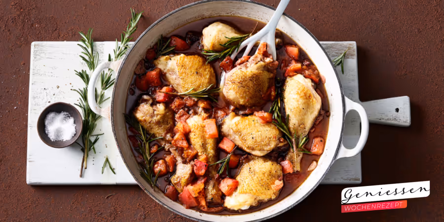 5. Die Pouletteile auf einen Teller geben. Im Bratensatz den Speck anbraten. Den Knoblauch beifügen und kurz mitdünsten. Alles mit dem Rotwein ablöschen und auf 1 dl einkochen lassen. Dann die Tomaten sowie die Pouletteile beifügen, mit Salz und Pfeffer würzen und halb gedeckt etwa 50 Minutenschmoren lassen. Nach 30 Minuten Garzeit die Rosmarinzweige beifügen. Am Schluss nach Belieben den Rosmarin aus der Sauce nehmen und diese mit Salz und Pfeffer abschmecken.