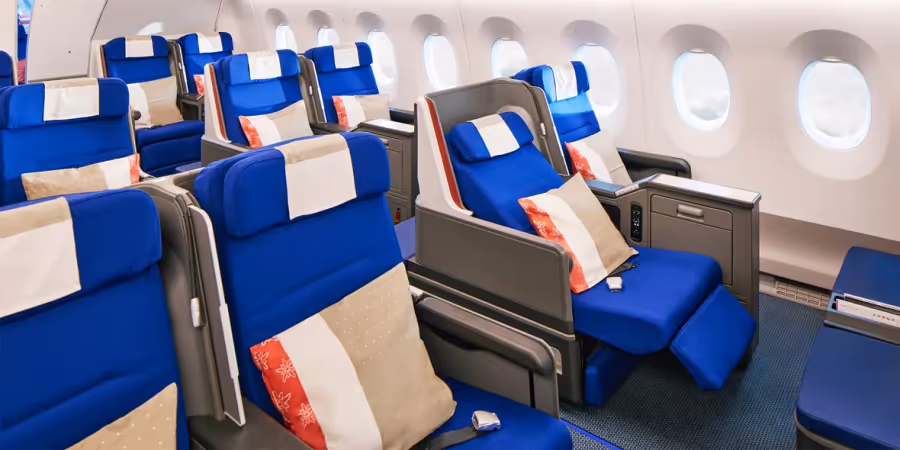 Wer sich ins Flugzeug setzt, landet häufig auf einem blauen Sitz.