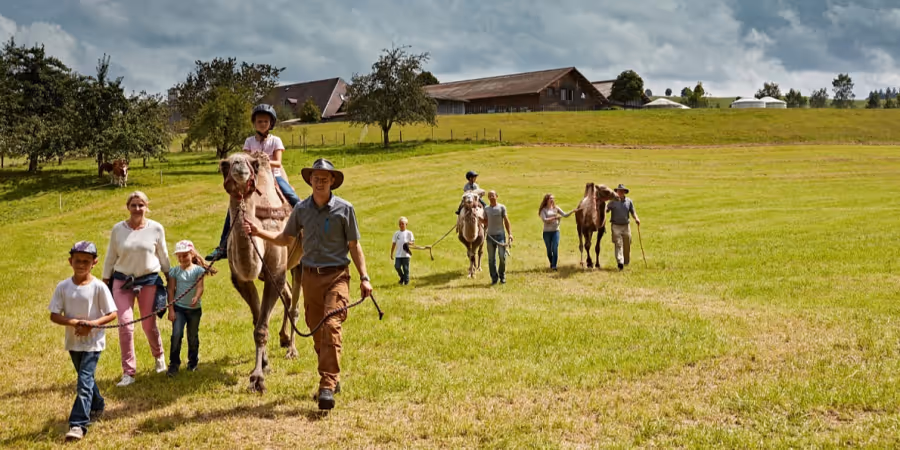Zwischen April und Oktober stehen direkt hinter dem Bauernhof «untere Bäch» sieben Jurten. Jede wird einzeln an Familien oder Gruppen vermietet. Die kleinste bietet Platz für vier, die grösste kann acht Personen beherbergen. Direkt daneben weiden Kamele und Schafe. Wer mit den Zweihöckern auf Tuchfühlung gehen möchte, kann ein Kameltrekking (für Kinder ab 5 Jahren) buchen.