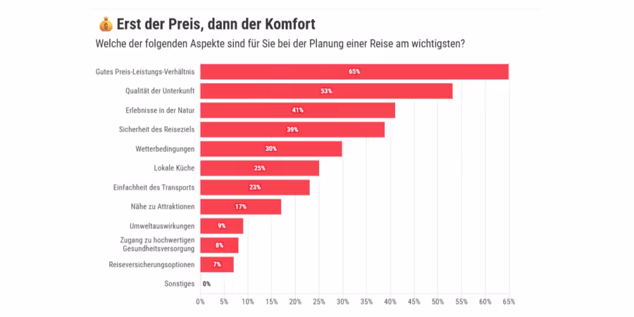 Ein markanter Trend ist das gestiegene Bedürfnis nach Sicherheit. Über zwei Drittel der Schweizer nehmen geopolitische Instabilitäten heute bewusster wahr als noch vor fünf Jahren. Dies spiegelt sich auch in der Reiseplanung wider. Das Preis-Leistungs-Verhältnis ist für 60 % der Reisenden entscheidend.