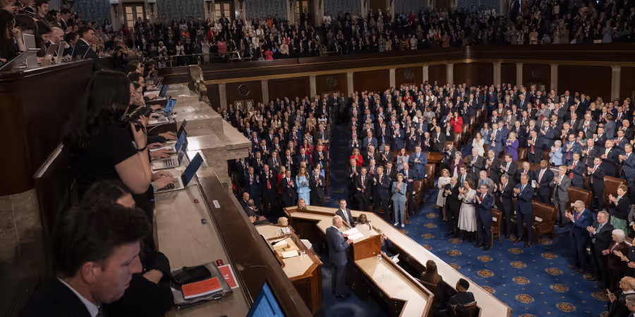 Heute sei «dieselbe unerschütterliche Entschlossenheit erforderlich, um die Ukraine und ihr mutiges Volk zu verteidigen», sagte er in Richtung des Sprechers des Repräsentantenhauses, Mike Johnson.