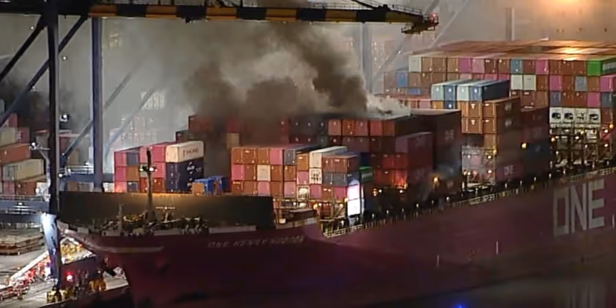 Containerschiff mit Gefahrgut brennt im Hafen von LA