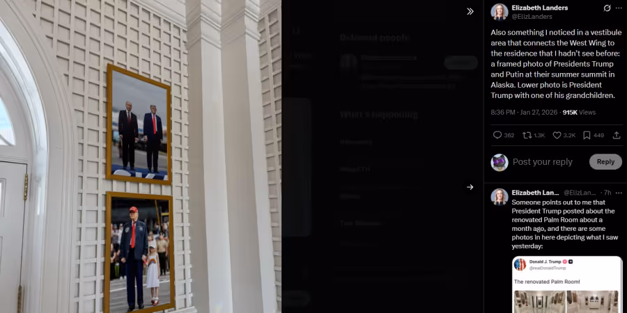 Die Fernsehjournalistin Elizabeth Landers von «PBS» veröffentlichte auf X ein Foto aus einem Vorraum zwischen Westflügel und Residenz. Dort hängt ein gerahmtes Bild, das Trump und Kremlchef Wladimir Putin bei ihrem Sommergipfel in Alaska zeigt.