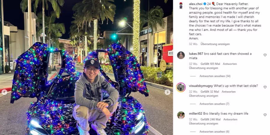 Immer wieder postet der erfolgreiche US-Influencer und Youtuber Alex Choi Fotos und Videos von teuren Autos. Doch ein Filmchen könnte ihn nun ganz teuer zu stehen kommen. Es hat ihm eine Anklage eingebracht.