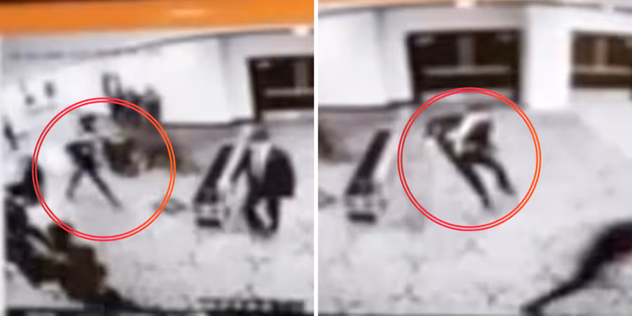 Im Video sind Sicherheitsmitarbeiter an einem Kontrollpunkt zu sehen. Dann taucht am linken Bildrand eine Person auf und rennt durch die Kontrolle.