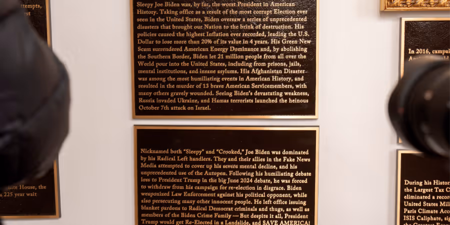 Trumps eigene Plakette rühmt seinen Sieg 2024 und betont, er habe zwei Attentatsversuche sowie die «Instrumentalisierung der Strafverfolgung» überwunden.