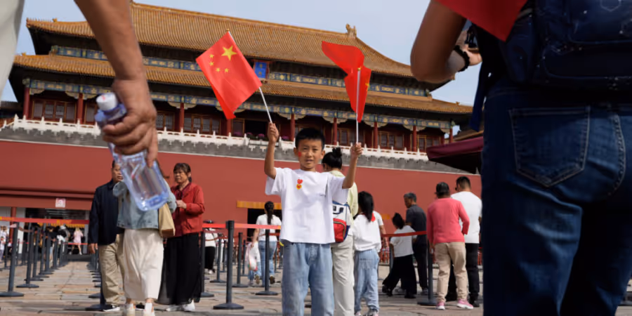 ARCHIV - Ein Kind posiert für Fotos mit chinesischen Nationalflaggen vor der Verbotenen Stadt während des Nationalfeiertags. Foto: Ng Han Guan/AP/dpa - Keystone/AP/Ng Han Guan