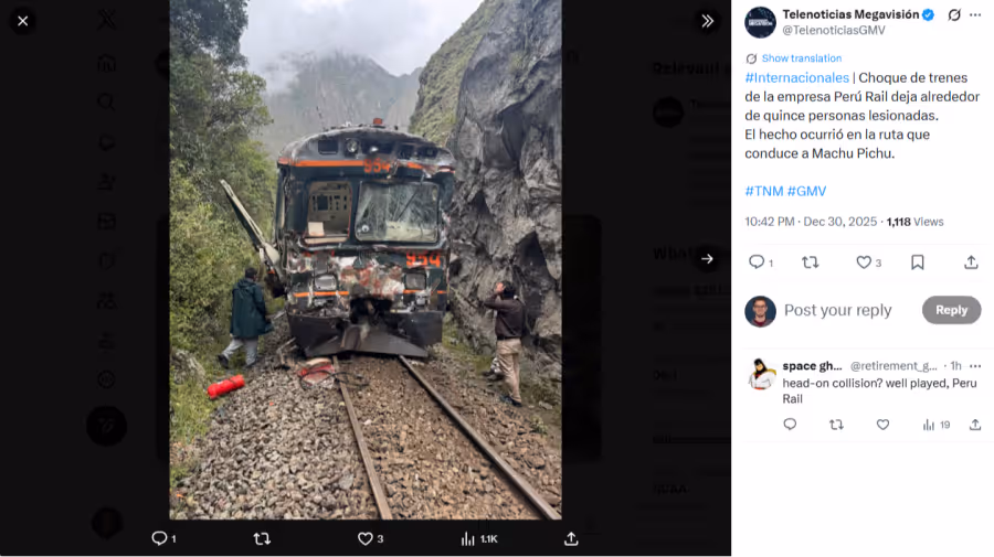 Die Eisenbahngesellschaft Ferrocarril Transandino teilte mit, ein von PeruRail betriebener Zug sei gegen Mittag (Ortszeit) auf der eingleisigen Strecke, die die Stadt Ollantaytambo mit Machu Picchu verbindet, mit einem Zug der Gesellschaft Inca Rail kollidiert. Die Ursache für den Zusammenstoss war zunächst unklar.