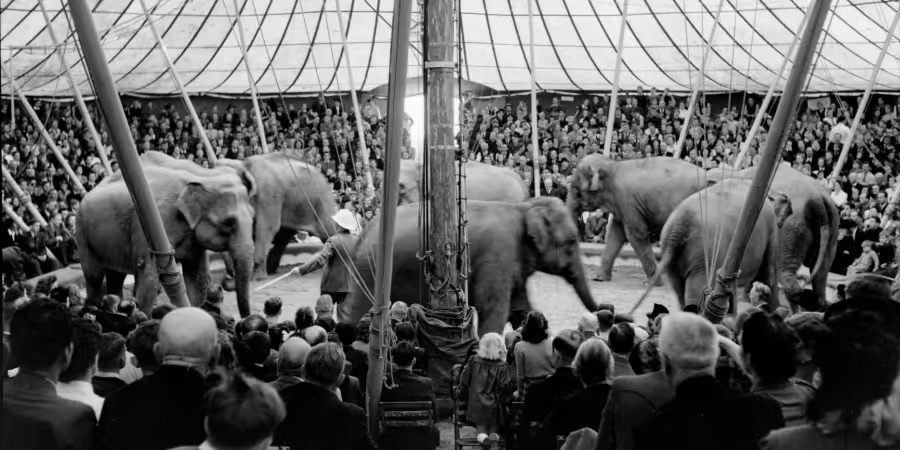 Lange Zeit waren Elefanten neben anderen Wildtieren eine Attraktion in den Vorstellungen des Circus Knie. Im historischen Bild ist Rolf Knie senior mit mehreren Elefanten in der Manege in Rapperswil SG zu sehen.