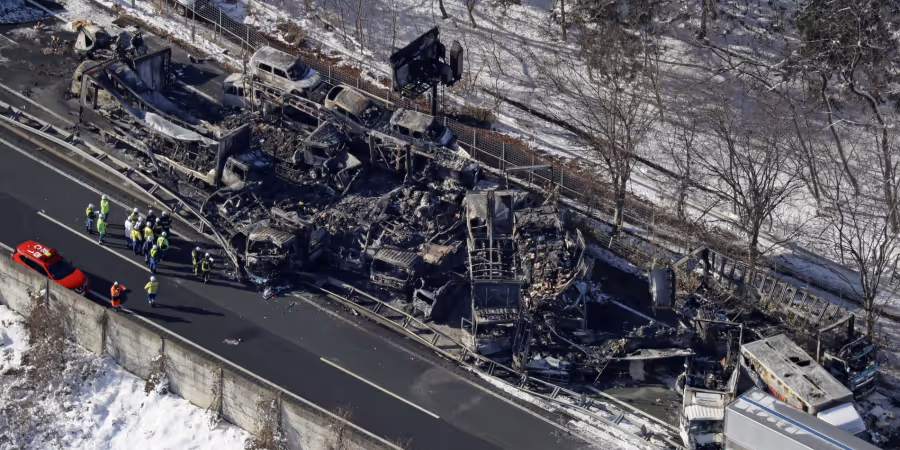 Die Löscharbeiten dauerten über sieben Stunden, wie die Polizei mitteilte. Auf Luftaufnahmen war eine lange Reihe stark beschädigter und völlig verkohlter Fahrzeuge zu sehen.