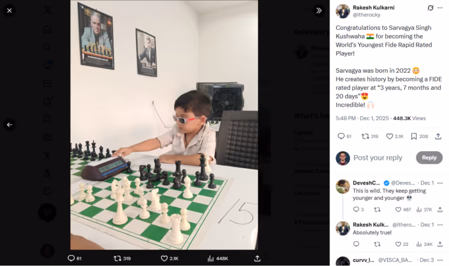 - Sarwagya Singh Kushwaha hat mit drei Jahren eine Schach-Wertungszahl erreicht.
