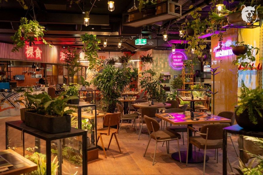 Oder Platz nehmen im hell gestalteten Gastraum im Stil einer Stadtgärtnerei, mit Streetart an den Wänden und Blick in die offene Küche.