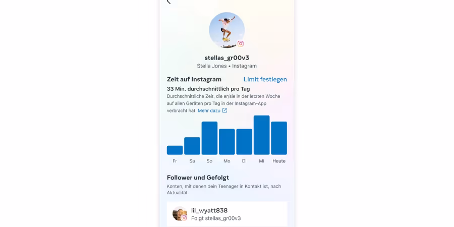 Eltern erhalten Einsicht in weite Teile der Social Media-Aktivitäten ihrer Kinder. Mit der Elternaufsicht können sie zum Beispiel: Zeitlimits setzen und Pausenzeiten einstellengemeldete Inhalte und Accounts überprüfen einen Überblick über die Follower der Kinder erhalten - was auch wöchentliche Benachrichtigungen beinhaltet, wenn ein neuer Kontakt hinzukommt.
