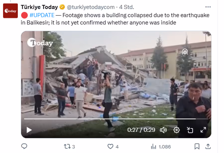 Fernsehbilder zeigten ein eingestürztes Gebäude in Balikesir. Innenminister Ali Yerlikaya berichtete, dass drei Menschen im Krankenhaus behandelt werden, ein Mann kam ums Leben.