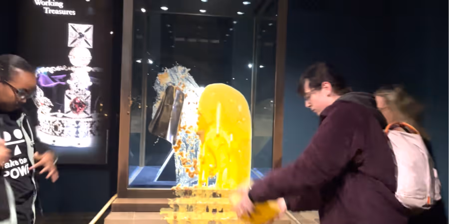 Die Zeitung «The Telegraph» veröffentlichte ein Bild, das während des Angriffs entstanden sein soll. Zu sehen ist, wie eine gelbliche Flüssigkeit auf die Vitrine geschüttet wird. Der Zeitung zufolge handle es sich um eine Art Crumble mit Vanillesosse.