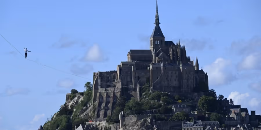 Er wollte die berühmte Felseninsel Mont-Saint-Michel «mal anders zeigen»: Der französische Hochseilkünstler Nathan Paulin ist über eine 2,2 Kilometer lange Slackline in 100 Metern Höhe auf die Insel in der nordfranzösischen Normandie balanciert.