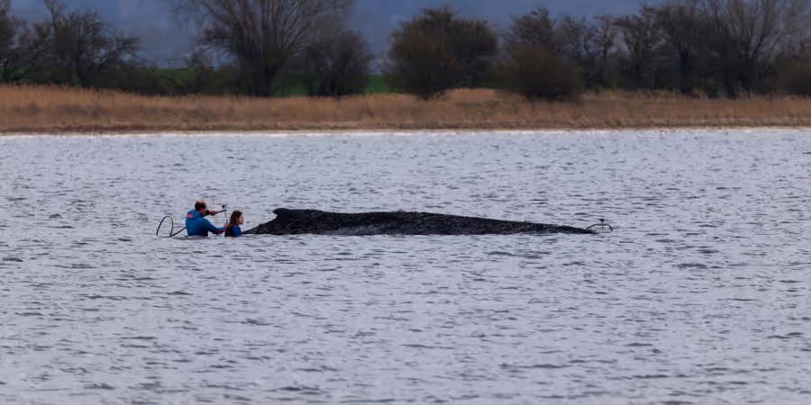 Der Katamaran sei in Dänemark verfügbar und könne den zwölf Tonnen schweren Wal aufnehmen, sagte Backhaus weiter. Die Idee: «Es werden 80 Zentimeter bis 1 Meter breite Gurte unter dem Wal durchgespült, ganz vorsichtig, um dem Wal nicht zu schaden», sagte Backhaus.