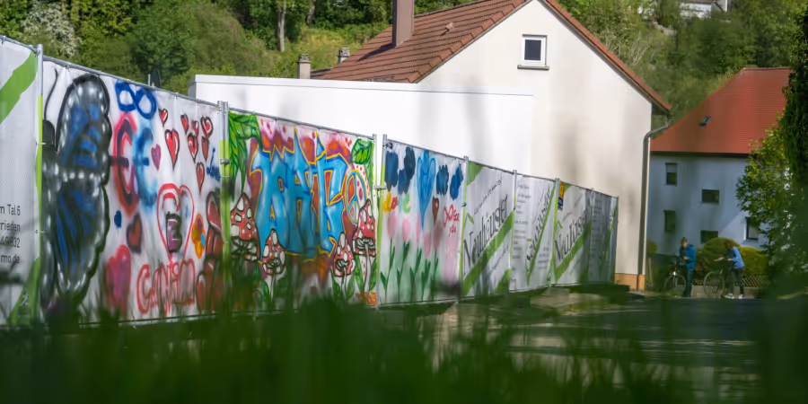Drei bemalte Bauzäune markieren die Stelle, an der eine 14-Jährige durch ein Messer ihr Leben verlor und ihre 13-jährige Freundin schwer verletzt wurde.