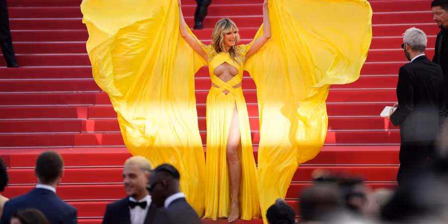 Mit einem auffallenden Kleid hat Model Heidi Klum am Mittwochabend auf dem roten Teppich in Cannes die Blicke auf sich gezogen. Die 49-Jährige erschien in einem leuchtend gelben Kleid mit fliessenden, überlangen Ärmeln und Cut-Out-Ausschnitt, der ihr Dekolleté betonte. Auf den Treppen zum Festivalpalast posierte sie für die Fotografen.