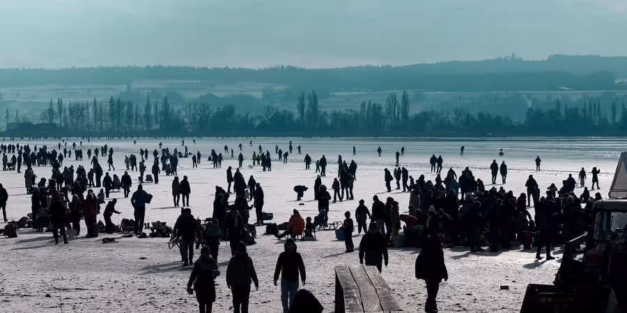 Ob zum Spazieren oder Schlittschuhlaufen: Auf der Eisfläche zwischen Allensbach und Reichenau versammeln sich momentan Klein und Gross.