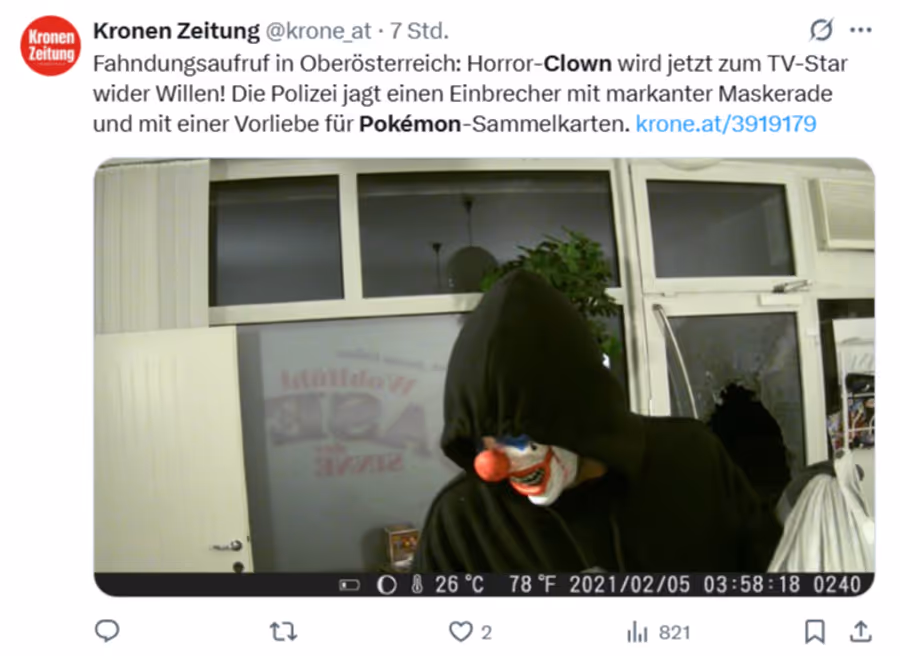 - Ein Einbrecher mit Clown-Maske hat in Österreich zweimal Pokémon-Karten geklaut.
