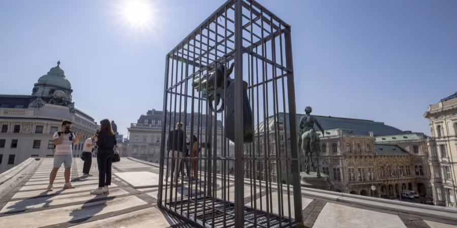 Eine überlebensgrosse Waffe in einem Käfig thront in den kommenden Monaten als künstlerisches Symbol auf der Albertina in Wien.