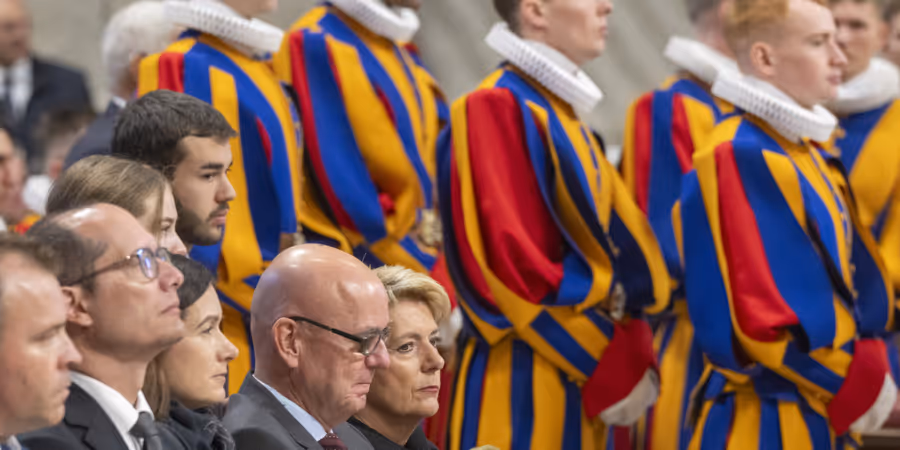 Durch einen Seiteneingang betreten die geladenen Gäste den Sakralraum der Basilica di San Pietro. Zu ihnen gehören die Bundespräsidentin Karin Keller-Sutter, der Vorsteher der Schweizer Armee, Korpskommandant Thomas Süssli und Nationalratspräsidentin Maja Riniker.