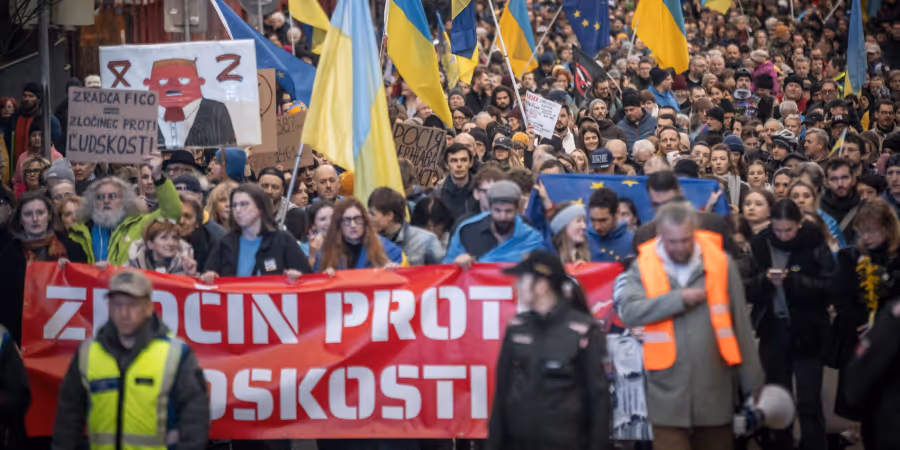 Vor dem Hintergrund eines Streits über Energielieferungen sind Tausende Menschen in der slowakischen Hauptstadt Bratislava zu einer Solidaritätskundgebung für die Ukraine auf die Strasse gegangen. Sie gedachten der ukrainischen Opfer des russischen Angriffskriegs und protestierten zugleich gegen den slowakischen Ministerpräsidenten Robert Fico. Der linksnationale Politiker hatte einen Stopp von Strom-Hilfslieferungen an die Ukraine angekündigt, weil diese russische Erdöl-Lieferungen an die Slowakei blockiere.
