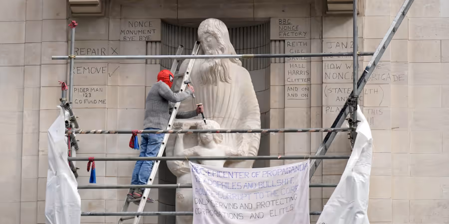 Mit Hammer und Meissel hat ein Mann eine Statue eines umstrittenen Bildhauers am Hauptquartier der BBC in London attackiert. Der Mann kletterte dazu am Samstagmorgen mit einer Spiderman-Maske vermummt auf ein Gerüst, das für Reparaturarbeiten an der bereits zuvor angegriffenen Statue aufgebaut war, und hisste ein Transparent, auf dem er den öffentlich-rechtlichen Sender sowie die Polizei scharf kritisierte. Die Polizei griff aus Sorge um die Sicherheit des Angreifers und ihrer Beamten vorerst nicht ein.