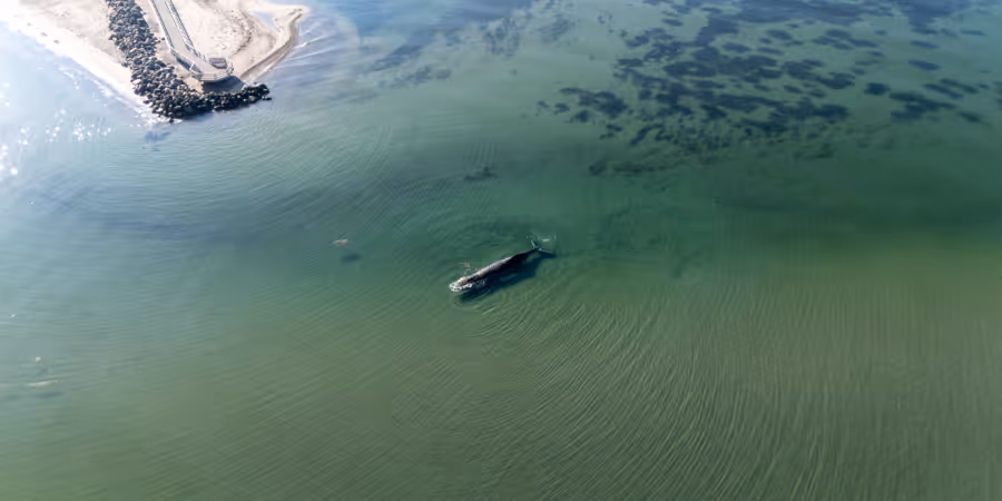 Mit einer Drohne machten sich die ITAW-Mitarbeiter ein Bild aus der Luft, um einzuschätzen, wie das auf einer Sandbank festliegende Tier befreit werden kann.