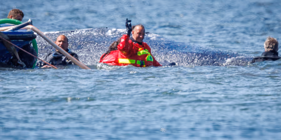 «Mir fällt wirklich ein Stein vom Herzen», sagte der Umweltminister des Bundeslandes Mecklenburg-Vorpommern, Till Backhaus, im Hafen von Kirchdorf. «Ich war auch kurz davor, ins Wasser zu springen, um ihm noch auf den letzten Meter mitzuhelfen». Er habe sich dann aber zusammengerissen. Der Minister sagte, er habe auf dem Schiff, von wo er die Aktion beobachtete, geweint.