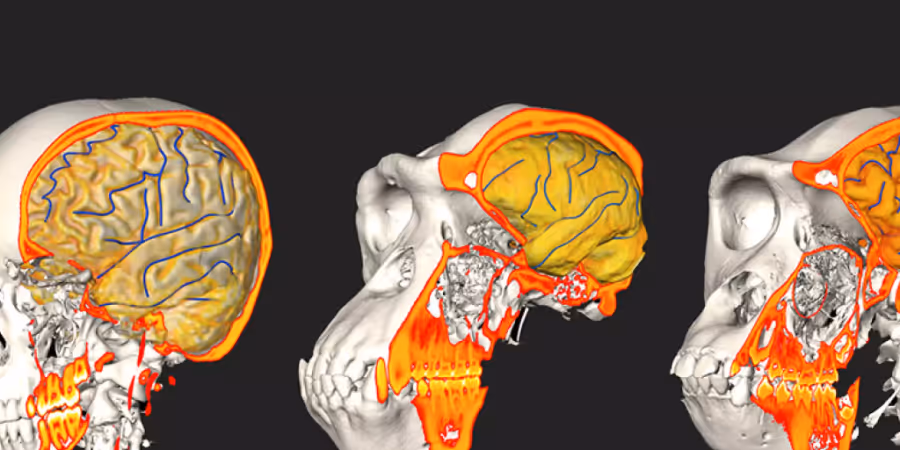 Der Frage, ob Veränderungen des Schädels die Entwicklung von Hirnstrukturen geprägt haben oder auch umgekehrt, ist auch ein Team um José Luis Alatorre Warren und Christoph Zollikofer von der Universität Zürich nachgegangen: Die Wissenschaftler nutzten dafür Daten aus Computer- und Magnetresonanztomografie von Menschen und unseren nächsten lebenden Verwandten, den Schimpansen.