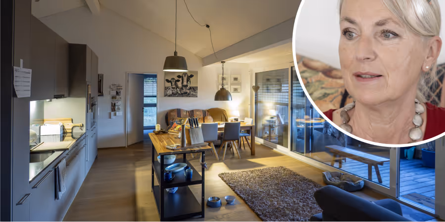 Ute Born sitzt am Esstisch eines Ehepaars etwas ausserhalb von Bern. Die Wohnung ist gemütlich eingerichtet, mit Dachschräge und einem markanten Balken, der quer hindurch verläuft.