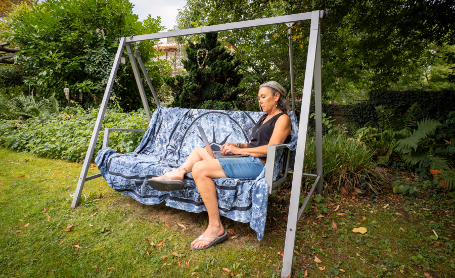 Livia Anne Richard wählt als Gesprächsort ihr Zuhause und wir setzen uns an den Gartentisch mit Blick auf ihren Lieblingsplatz, eine Hollywood-Schaukel.