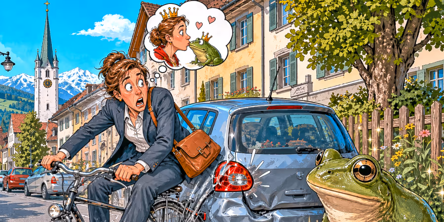 Hätte ich doch lieber vorher angehalten und den Frosch geküsst. Wer weiss, welche Wendung mein Leben auf diese Weise genommen hätte. So aber hat der Frosch einzig dafür gesorgt, dass das parkierte Fahrzeug und mein Velo bei der Kollision erhebliche Schäden erlitten haben.