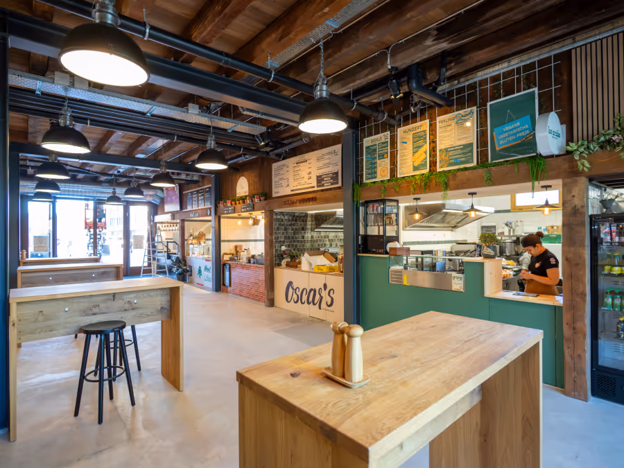Kurz vor dem Mittag riecht es hier auch schon sehr verführerisch: In den sechs Foodboxen, von indisch über asiatisch, italienisch und libanesisch bis zum klassischen Burger, wird bereits fleissig gekocht. Gleich vis-à-vis gibt’s eine Café- und Weinbar, die sich als sozialer Treffpunkt anbietet.