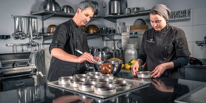Weil Eva Werlen keine gelernte Konditorin ist, stösst auch Fabian Sänger zum Team. Der deutsche Chef-Chocolatier arbeitete jahrelang in der Spitzengastronomie, schrieb Bücher und führte ein eigenes Unternehmen.
