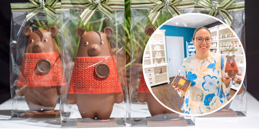 «In Bern musst du fast mit dem Bär spielen», meint sie augenzwinkernd und hält einen der hauseigenen Schoggi-Bären in der Hand. Lässig steht er da, mit Pullover aus Bergheumilch-Schoggi – ein echter Berner Typ.