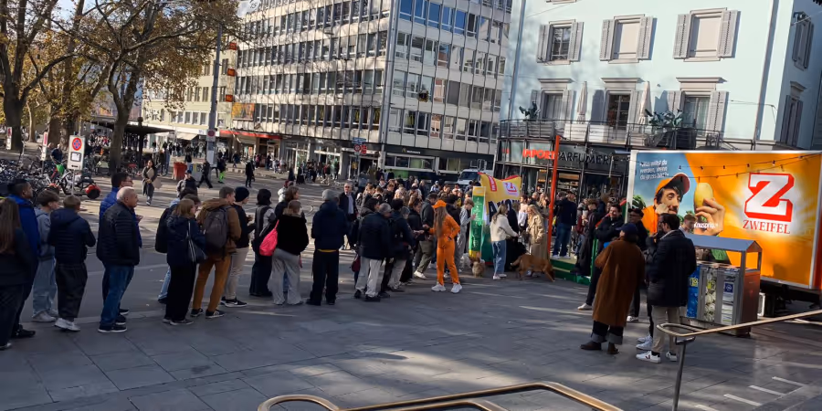Die Schlange zieht sich bis zum neuen Megabau, dem Haus zum Falken. Nau.ch ist vor Ort.