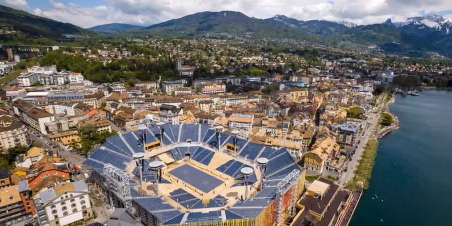 Die Bauarbeiten an der gigantischen Arena für die Fête des vignerons in Vevey stehen kurz vor dem Abschluss. Schon bald finden im Stadion die ersten Proben für die Aufführungen im Juli und August statt.
