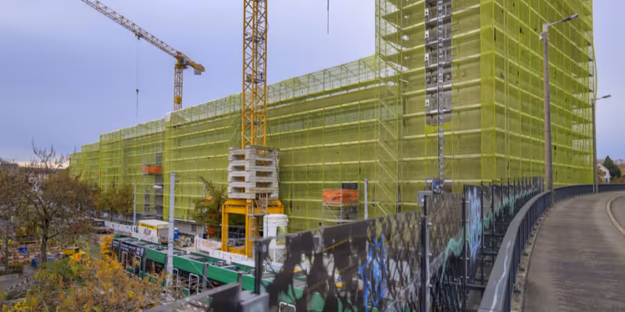 Inzwischen schreitet der Innenausbau in allen Geschossen voran, wie die Verantwortlichen am Freitag an einer Begehung vor den Medien erklärten. Der 170 Meter lange und bis zu 40 Meter hohe Neubau beim Bahnhof St. Johann hatte seit Baubeginn im Juni 2021 mit diversen Turbulenzen zu kämpfen.