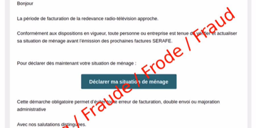 Die Serafe wird Sie niemals per E-Mail auffordern, Ihre Wohnsituation zu verifizieren, Ihre AHV-Nummer preiszugeben oder Kreditkartendaten einzugeben.