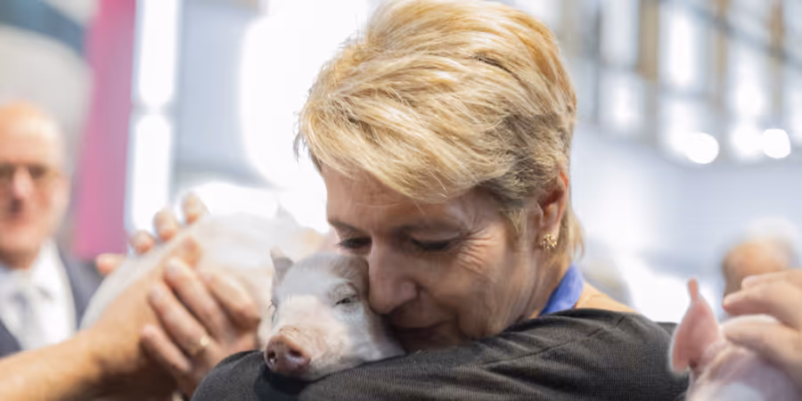Mit Säuli Paola auf dem Arm hat Bundespräsidentin Karin Keller-Sutter (FDP) am Donnerstag die 82. Olma in St. Gallen eröffnet. Berührungsängste zeigte Keller-Sutter dabei nicht, im Gegenteil. Sie herzte Paola innig.